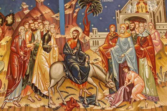 За шесть дней до Пасхи пришел Иисус в Вифанию, где был Лазарь, которого Иисус воздвиг из мертвых. Сделали Ему там вечерю, и Марфа служила. Лазарь же был одним из возлежащих с Ним. Тогда Мария, взяв фунт мира из нарда чистого, многоценного, помазала ноги Иисуса и отерла волосами своими ноги Его, и дом наполнился благоуханием мира. И говорит Иуда Искариот, один из учеников Его, которому предстояло предать Его: почему не продали это миро за триста динариев и не дали нищим? Сказал же он это не потому, чтобы заботился о нищих, но потому, что был вор и, имея денежный ящик, брал то, что туда опускали. Сказал тогда Иисус: оставь ее; нужно было, чтобы сберегла она миро на день погребения Моего. Ибо нищих вы всегда имеете с собою, Меня же не всегда имеете. Узнало тогда много народа из Иудеев, что Он там, и пришли не ради Иисуса только, но чтобы и Лазаря увидеть, которого Он воздвиг из мертвых. Первосвященники же решили убить и Лазаря, потому что многие из Иудеев ради него приходили и веровали в Иисуса. На другой день много народа, пришедшего на Праздник, услышав, что Иисус идет в Иерусалим, взяли пальмовые ветви и вышли навстречу Ему и восклицали: Осанна! Благословен Грядущий во имя Господне и Царь Израилев! Иисус же, найдя осленка, сел на него, как написано: Не бойся, дочь Сиона: вот, Царь твой грядет, сидя на молодом осле. Этого ученики Его не поняли сперва, но когда был прославлен Иисус, тогда они вспомнили, что это было о Нем написано, и это сделали Ему. Свидетельствовал же народ, который был с Ним, когда Он воззвал Лазаря из гробницы и воздвиг его из мертвых. Потому и вышел народ к Нему навстречу, что услышали, что Он сотворил это знамение.